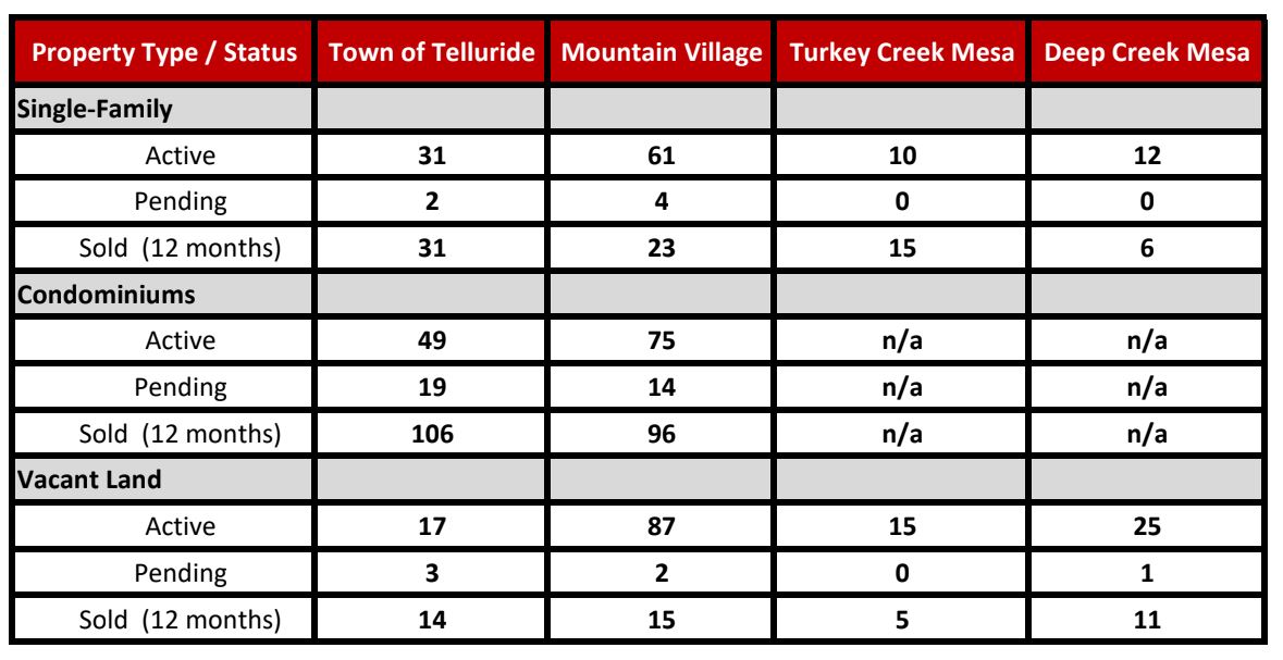 The Telluride real estate market continues to hold great potential for investment, rental income, personal enjoyment and asset appreciation. The Condo segment in the Town of Telluride is seeing the greatest demand for listings and inventory and is thus enjoying the highest rate of pricing growth. The best values and available inventory currently exist in Mountain Village and the nearby mesas.