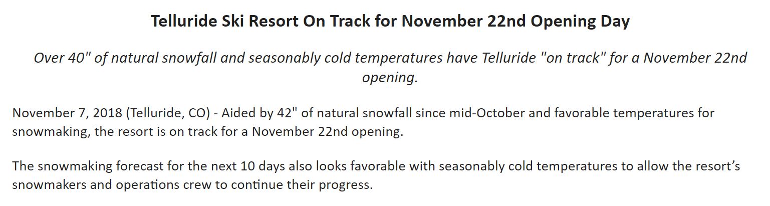 ShareTelluride Ski Resort On Track for November 22 Opening Day for the 2018-2019 Season By Robert StenhammerPosted Sunday, Nov 11, 2018 Tags Telluride Ski Resort